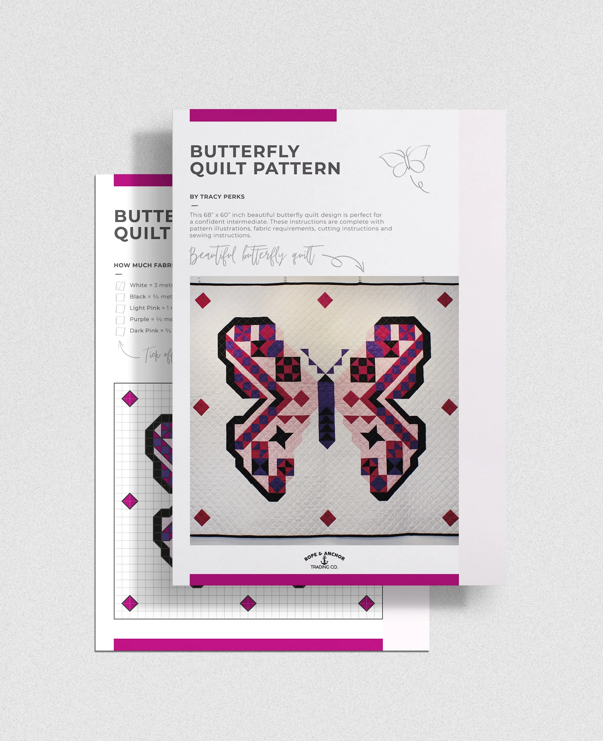 This 68 x 60 inch beautiful butterfly quilt design is perfect for a confident intermediate. These instructions are complete with pattern illustrations, fabric requirements, cutting instructions and sewing instructions.