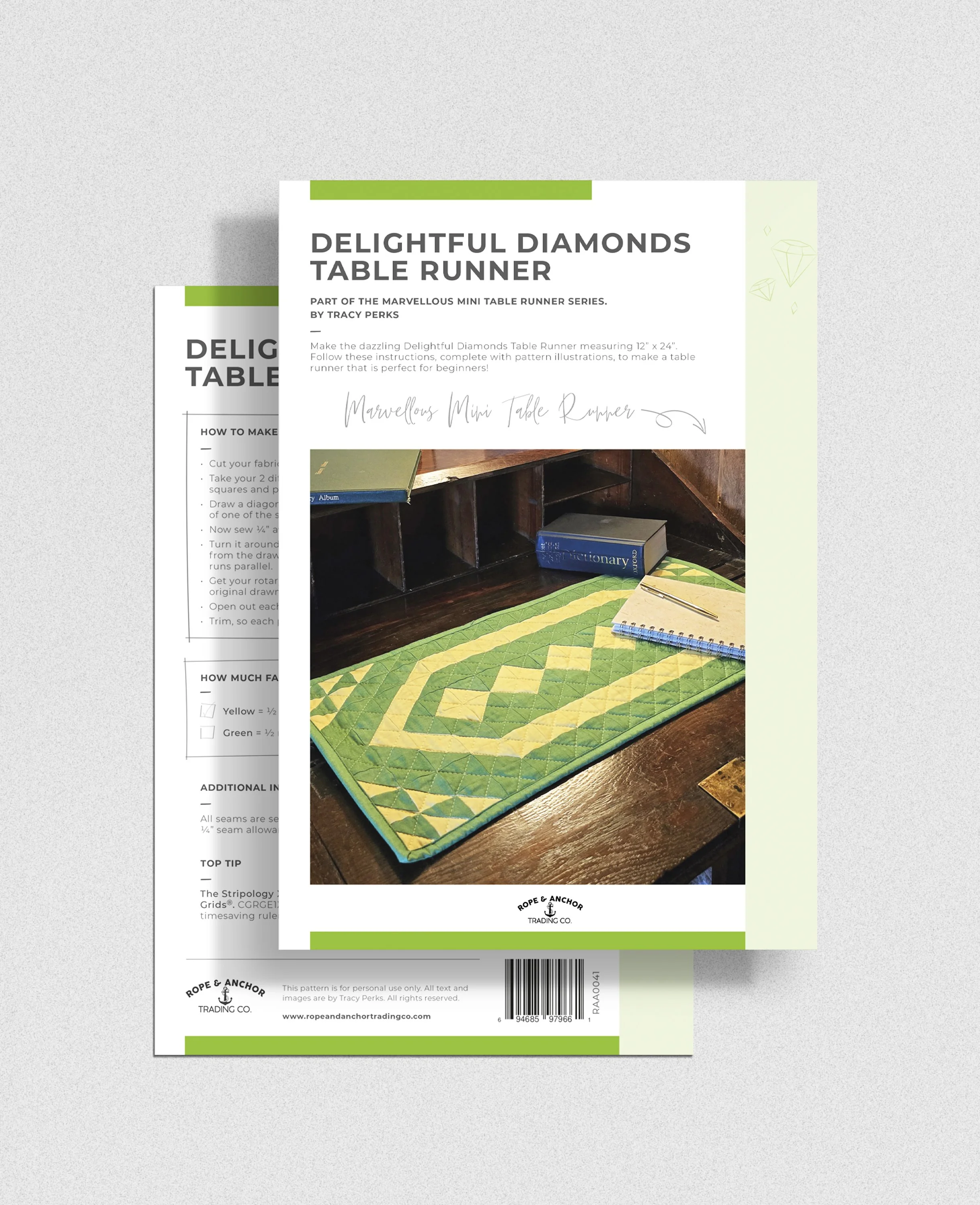 Make the dazzling Delightful Diamonds Table Runner measuring 12” x 24”. Follow these instructions, complete with pattern illustrations, to make a table runner that is perfect for beginners!